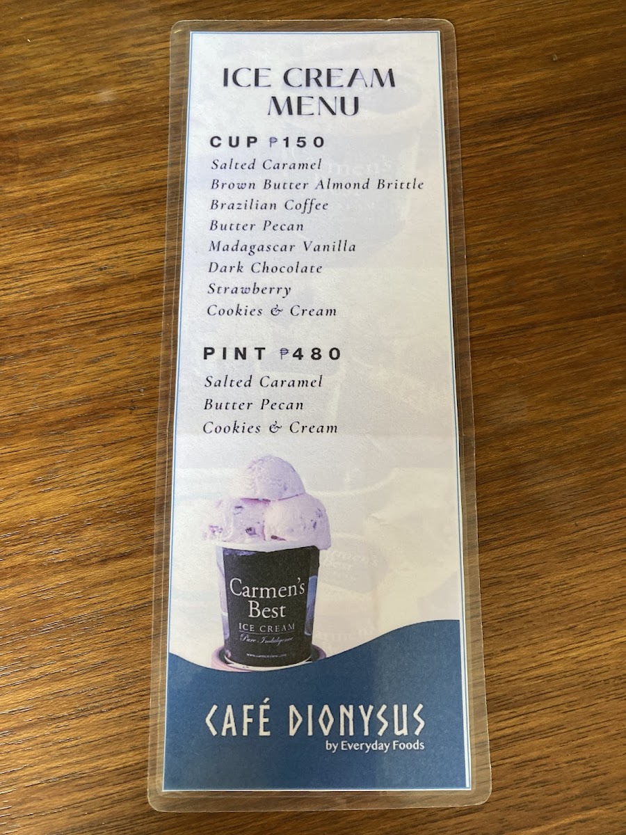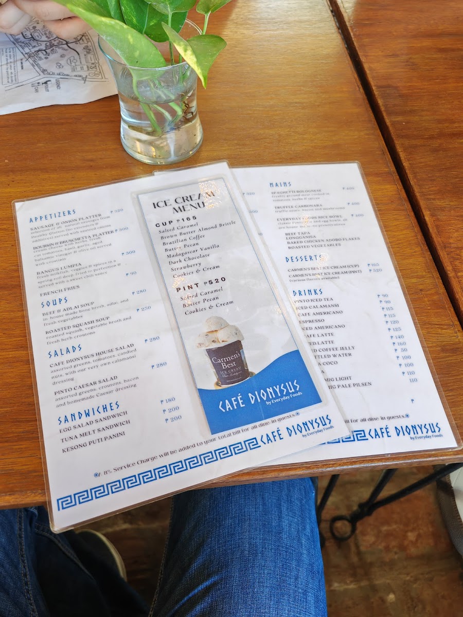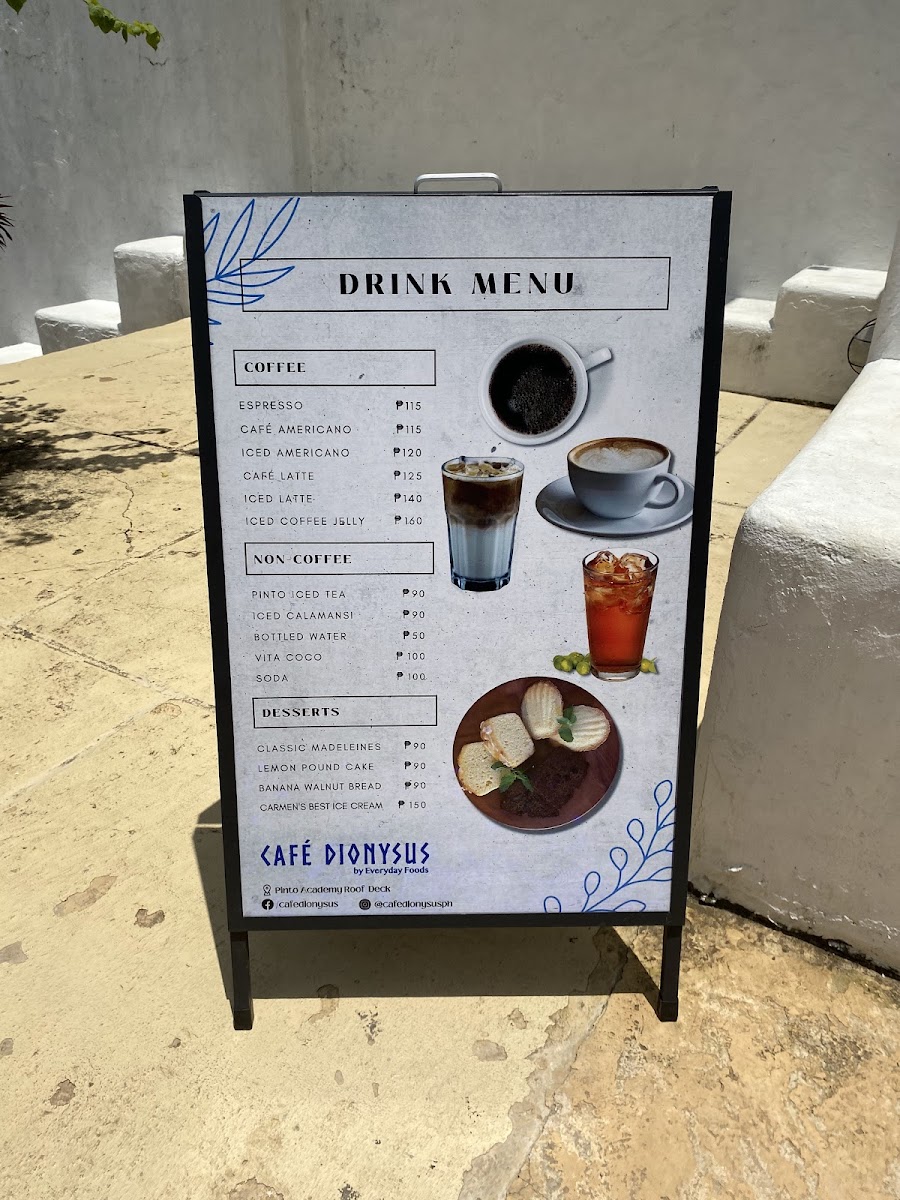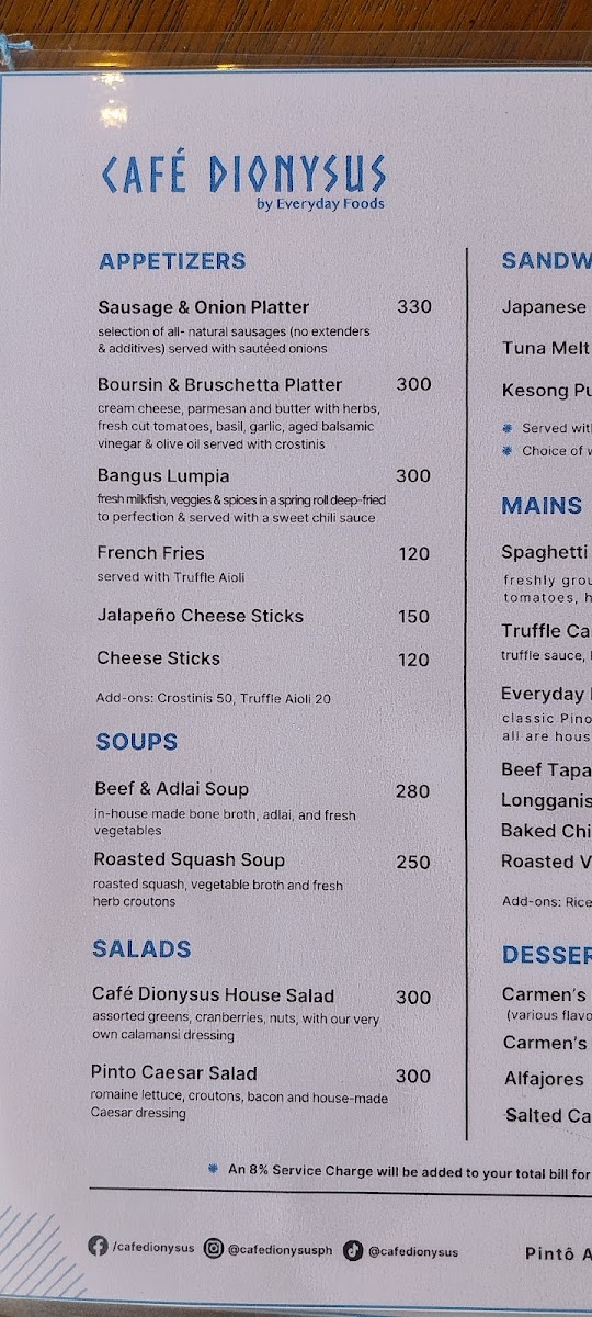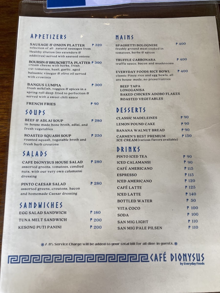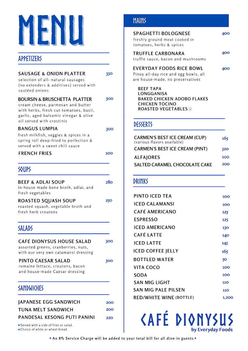 The menu at Café Dionysus features a variety of options organized into distinct categories, catering to different dining occasions such as breakfast, light meals, and coffee breaks. The food selection includes soups, main courses, and everyday rice bowls, while the beverage offerings cover a range of hot and iced coffee drinks, teas, and specialty iced beverages.