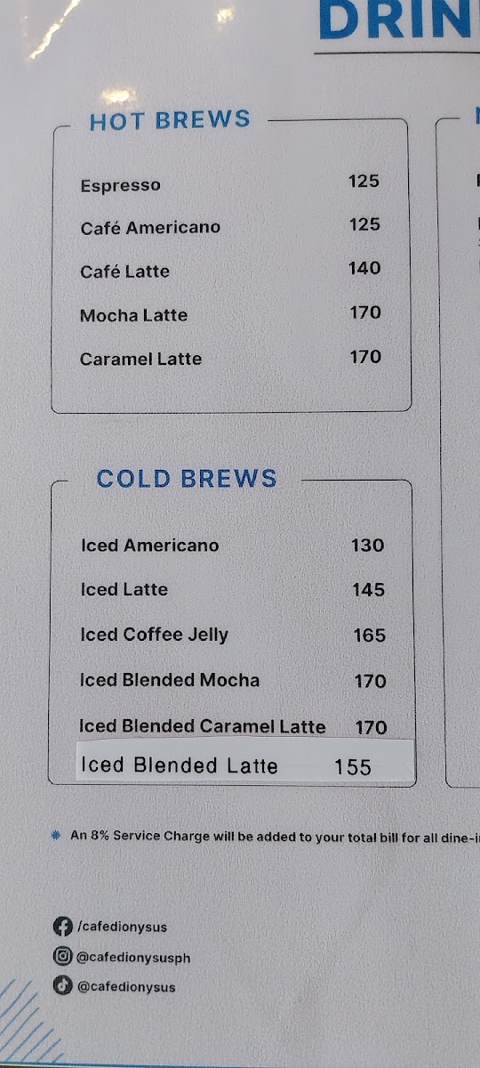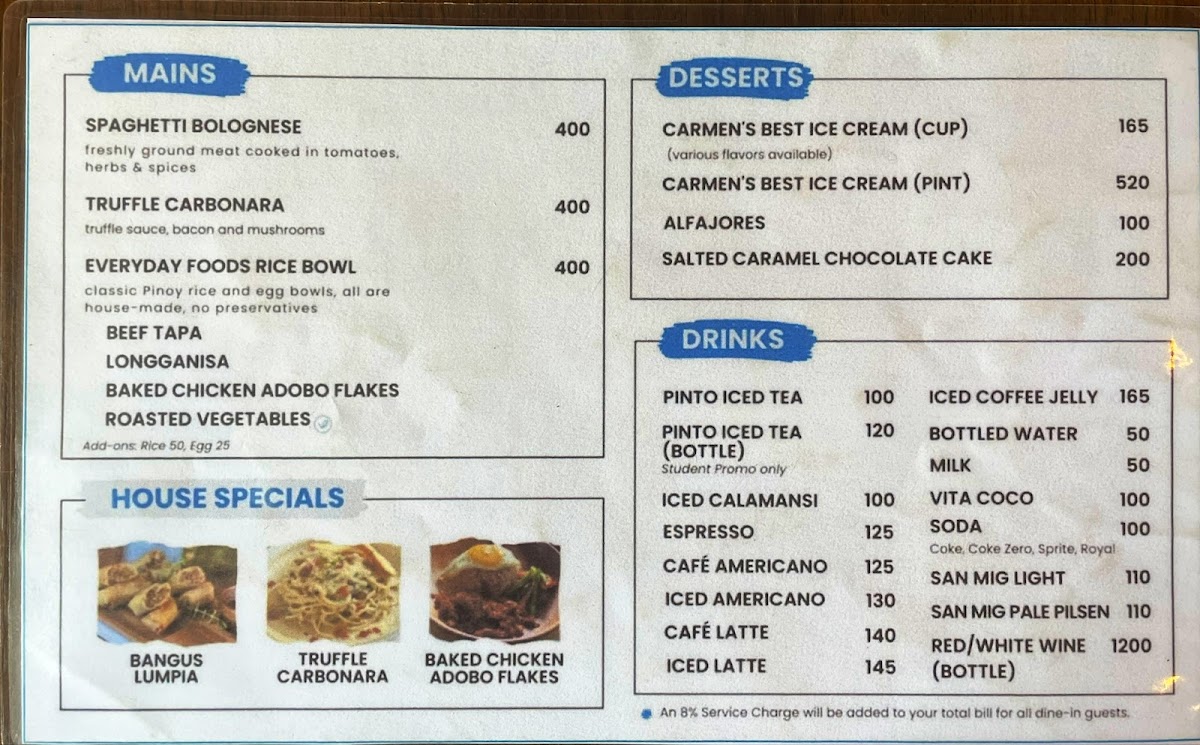 Beverages include various coffee options such as Espresso, Café Americano, Café Latte, and their iced versions, alongside iced tea and specialty drinks like Iced Coffee Jelly and Iced Calamansi.